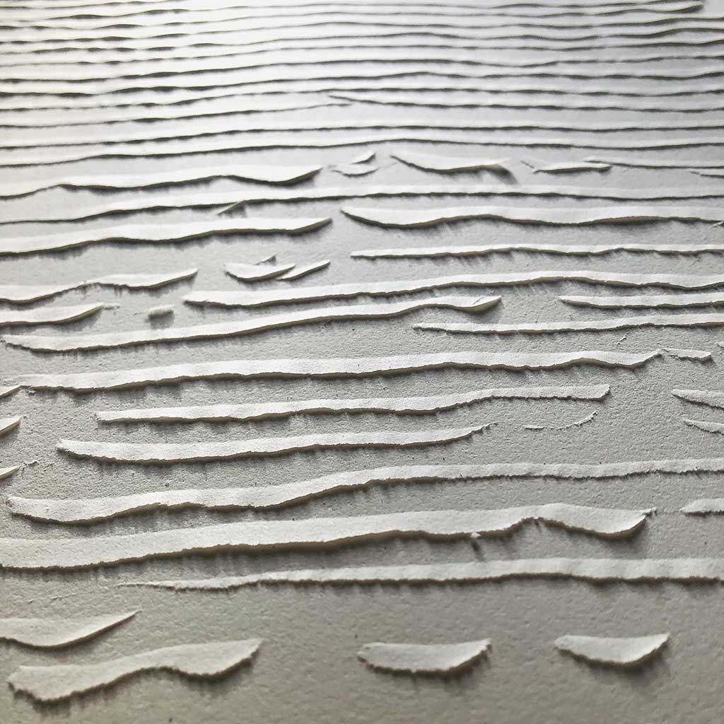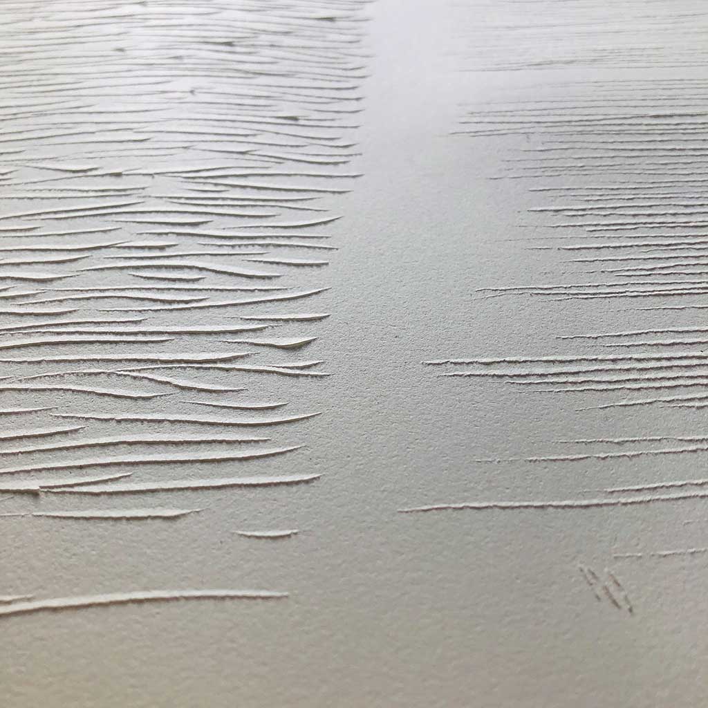 Marquer le papier comme on scande un rythme, l’acte de création est alors vu comme un décompte du temps. Temps subjectif et variable sur lequel je pose un regard interrogateur. Le geste répétitif qui marque la matière enlève tout superflu. C’est aussi par une épure de moyens, de couleurs, de formes que je tente une confrontation avec l’essence de ce qui fait l’acte et l’être en train de faire. Tout changement de rythme change la marque laissée sur le papier et témoigne d’un écart entre l’instant d’avant et celui d’après.